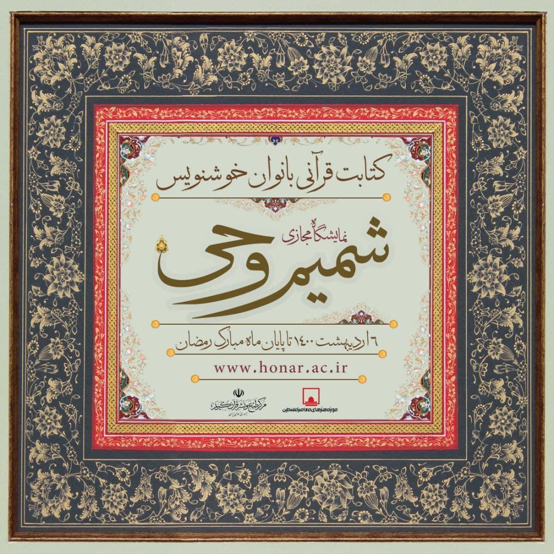 به گزارش خبرنگار حوزه فرهنگ و هنر گروه علمی فرهنگی هنری خبرگزاری صدا و سیما به نقل از روابط عمومی موزه هنرهای معاصر فلسطین، به مناسبت ماه مبارک رمضان نمایشگاه مجازی، کتابت قرآنی بانوان خوشنویس با عنوان «شمیم وحی» از روز دوشنبه ۶ اردیبهشت در وبگاه فرهنگستان هنر درمعرض دید علاقهمندان قرار گرفت.