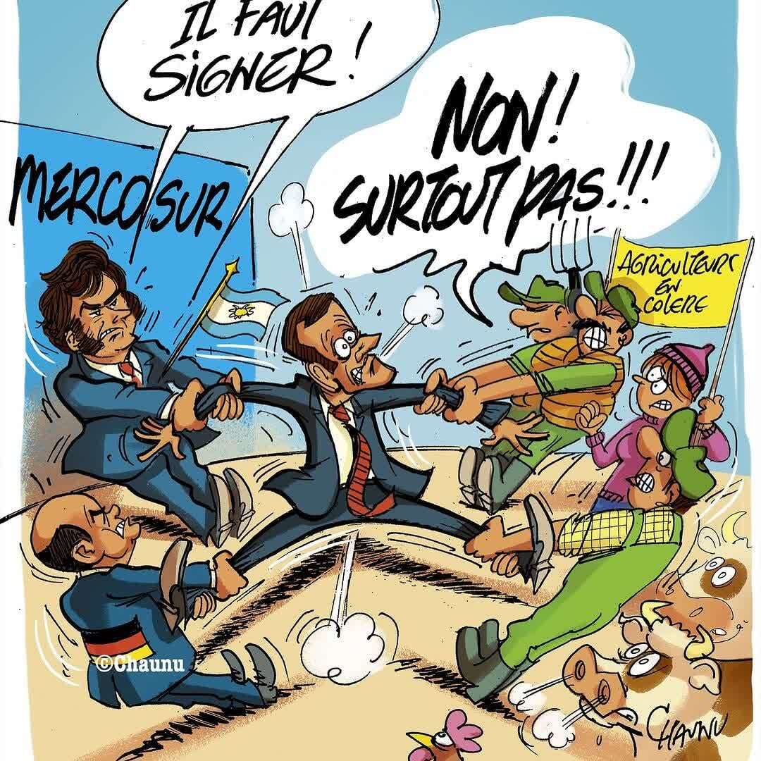 اِمانوئل شُنو، کاریکاتوریست فرانسوی، موضوع «اعتراض و بسیج کشاورزان به توافق تجاری اروپا با آمریکای جنوبی» را دستمایهٔ کاریکاتور خود قرار داده است.