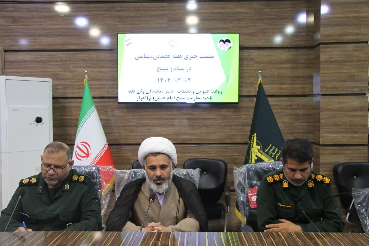 به گزارش خبرگزاری صدا و سیمای استان خوزستان، سرهنگ پاسدار نیسی زاده گفت: قرار است ۱۰۰ برنامه در هفته عقیدتی سیاسی در سطح ناحیه، حوزه‌های مقاومت، کانون‌ها، اقشار و پایگاه‌های بسیج ناحیه اجرایی شود.