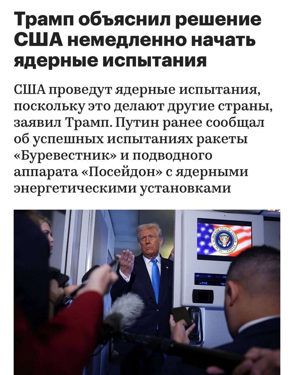 ⁃ دونالد ترامپ از تصمیم ایالات متحده برای آغاز فوری آزمایش‌های هسته‌ای خبر داد.