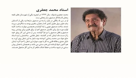 محمد جعفری متولد سال ۱۳۳۲ خورشیدی است، ۶ سال بیشتر نداشت که به جای مدرسه روانه بازار شد نزد حاج رسول خلیل آبادی که از قدیمی‌ترین نجاران زنجان بود نجاری می‌کرد.اکنون تنها صندوق ساز سنتی زنجان است.